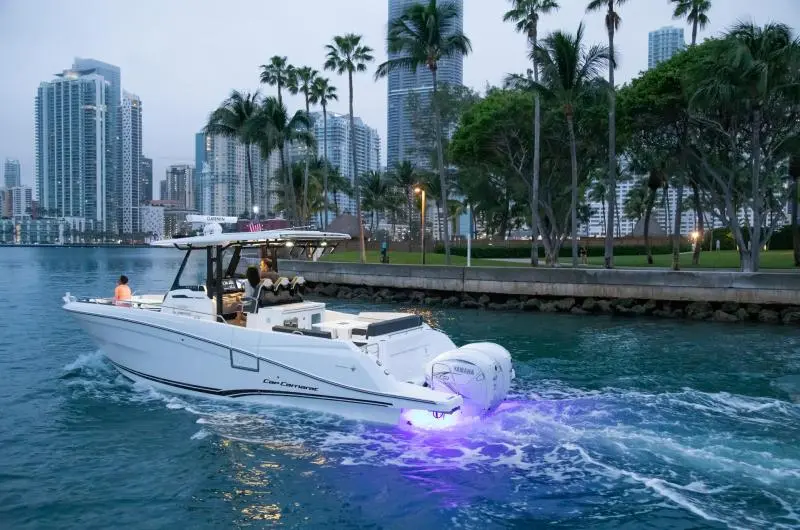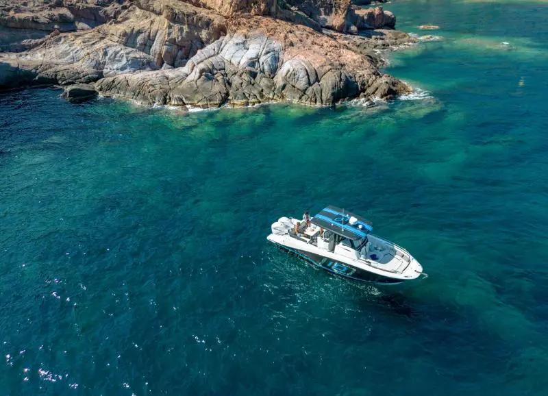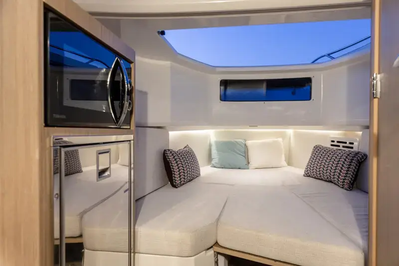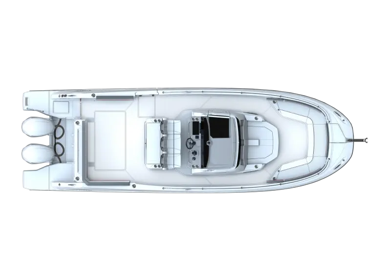With its V-shaped hull design for excellent seakeeping, powerful twin engines, 2 x 300 HP or 2 x 450 HP with joystick, and ergonomic helm station, you will enjoy long fast runs, comfortably seated and in perfect safety.