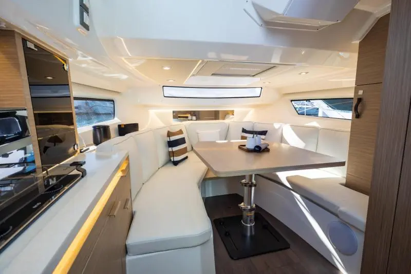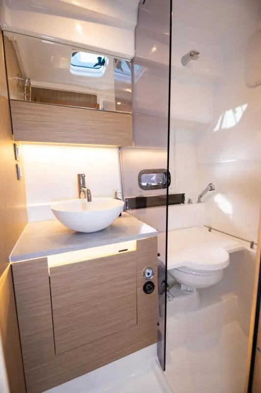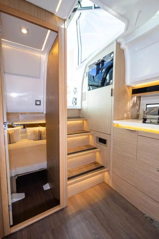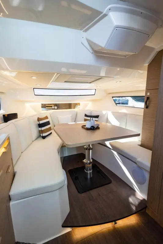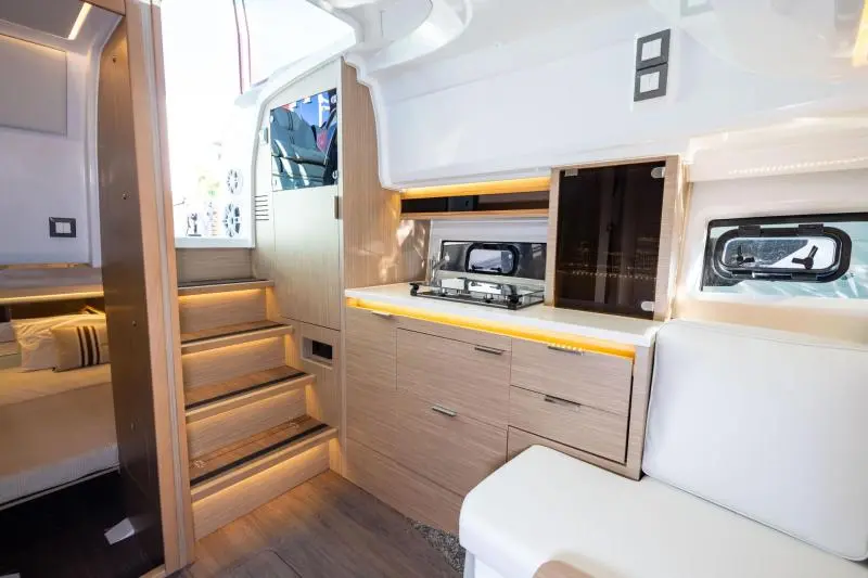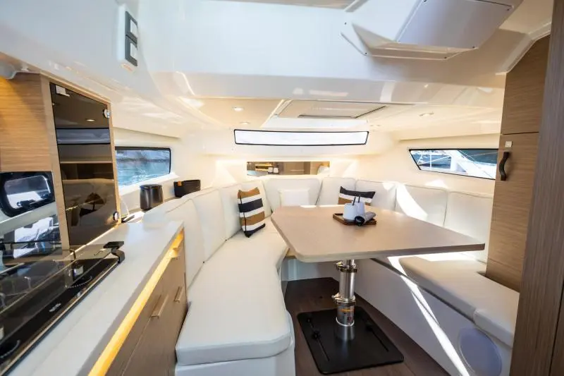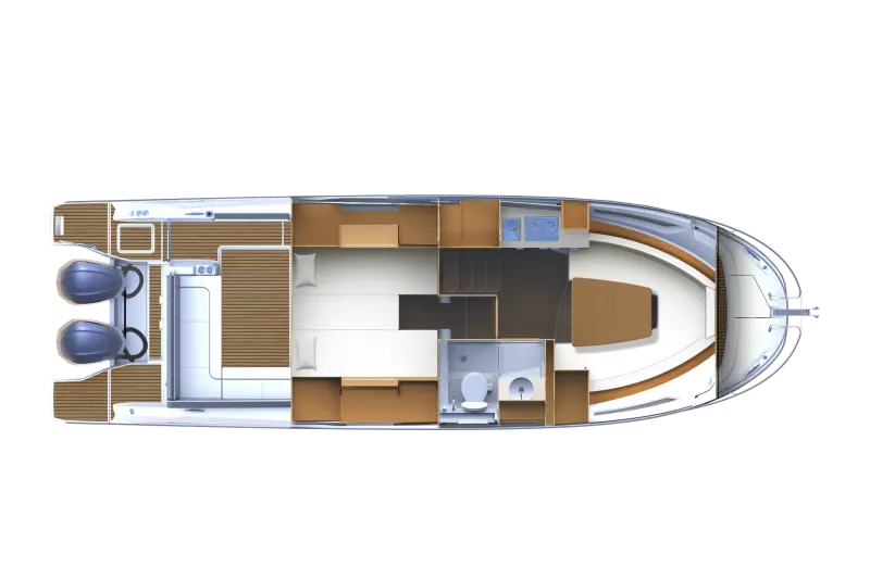 The Cap Camarat 10.5 WA invites you to extend your stopovers on the water in the greatest comfort. Perfectly integrated into the profile of the boat, the optional T-top enables you, with the addition of a sun awning aft, to dine in the shade. The outdoor galley, backing the seats of the helm station, includes a fridge, electric grill, a gas burner, storage, or even a live well to hold the catch of the day. Down below, optionally equipped with air conditions, the spacious and comfortable interior also features a second separate cabin aft. Forward, the traditional breakfast nook converts into a V-berth with separation curtain. This day boat has everything to give you a taste of cruising and nights at sea.