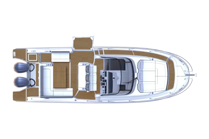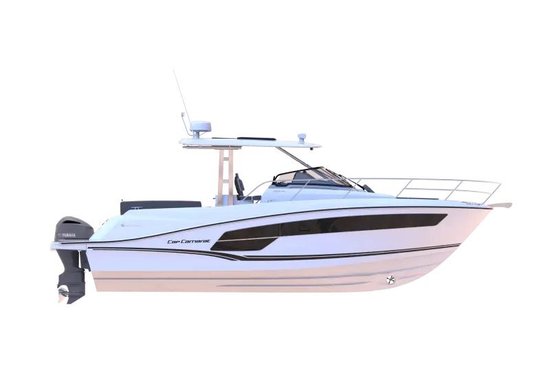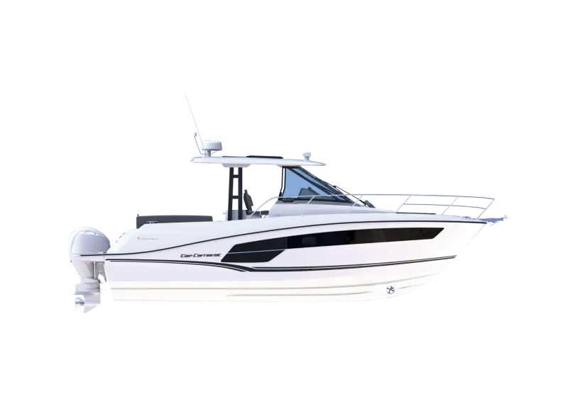With the Cap Camarat 10.5 WA, wait no longer to explore small creeks or to make long-er crossings. With a cruising speed of 20 knots, and peak speeds at over 40, the V-shaped hull designed by Michael Peters brings more strength and rigidity to this sport boat. Once at an-chor, there is something for everyone: a forward cockpit with three integrated chaise lounges perfect for relaxing, an opening terrace on port to create an additional swim platform equipped with a swim ladder, a convertible aft cockpit with removable table, all for you to choose in func-tion with your plans.