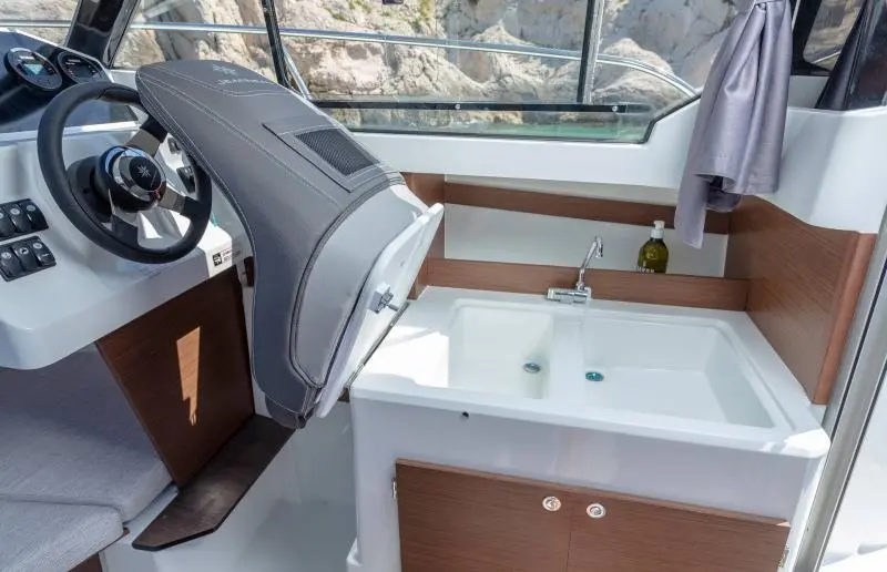 It’s crazy, all that you can do aboard a Merry Fisher 605 ! All the ingenuity and savoir-faire of Jeanneau results in optimised space on board, featuring a clever layout, sliding bench seating, a fold-up bolster seat, and convertible living spaces. Equipped with a sink, a refrigerator, and a 50-litre water pump, it will enable three or even four passen-gers to enjoy spending a night on board and savouring a nice breakfast on the water.