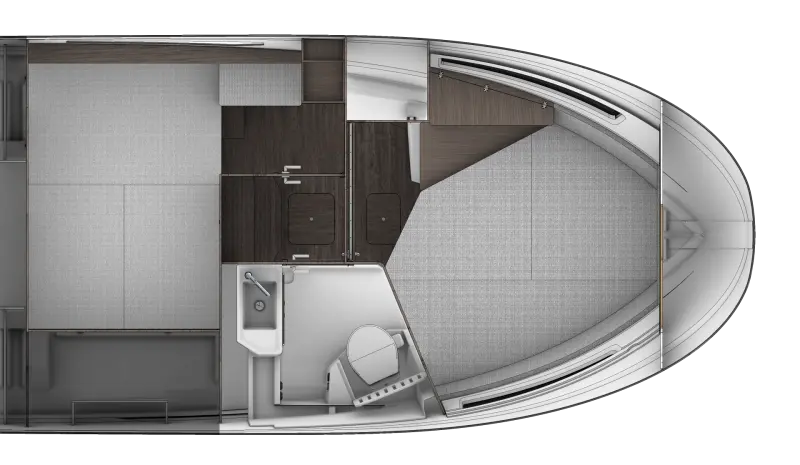 The Merry Fisher 895 Sport boasts an even bolder, more intrepid look: her inverted windscreen, long windows in the hull, black trim on the coachroof, and hull colours reinforce this identity. Yet this inviting model is also conducive to entertaining and relaxing together. The forward cockpit is a true separate saloon, while the bright, perfectly ventilated cabins invite you to enjoy a peaceful, well-deserved rest.