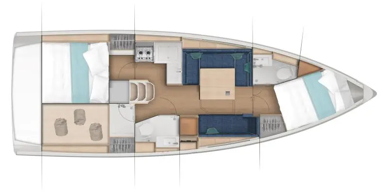 Wherever you look aboard the Sun Odyssey 380, down to the smallest detail, you find a combination of high performance, flow of movement and comfort on board. The inverted bow increases efficiency downwind, responsiveness at the helm, and ease of handling at port. Recessed sidedecks and twin steering wheels provide secure movement about the deck while improving visibility at the helm. The lowered boom facilitates sail access and augments the sail area without weighing down the boat. The lifting keel enables you to dry out on the sides, using removable poles, without impacting performance.
