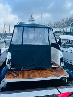 L Shape Seating, configurable as needed, with full set of cushion Dining table, drops down to sun pad – with cushion and legs Rod Holders Swim Ladder Fusion Marine Speakers Shore power in Shower – Hot and cold water LED Lighting Gas Locker Below seat storage boxes (lockable) Waste pump out Full width swim platform Teak decking Bimini top / sun canopy with Full enclosure
